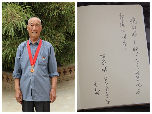 走进老党员郭俊仁家中,坐在窗明几净的大瓦房里,队员们与老人热络地聊了起来。郭俊仁老人今年已经80岁,有着56年党龄,少年时便跟随父辈帮助解放军运送军粮等物资,为支援解放战争做出了积极贡献。1965年入党,因表现突出连年被评为优秀党员,曾在庆阳地委工作,文革时期因坚持原则不愿随波逐流,自愿回到家乡从事乡镇基层工作直到退休。他还向队员们自豪地展示了自己与甘肃省军区原副司令员何志瑛少将的合影,以及何将军的亲笔题词“党的好干部,人民的好儿子郭俊仁同志”,让队员们对这位老党员的敬佩之情油然而生。