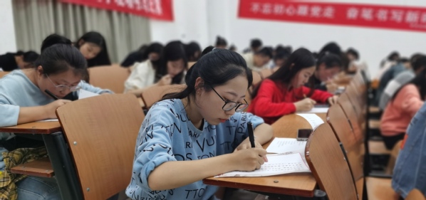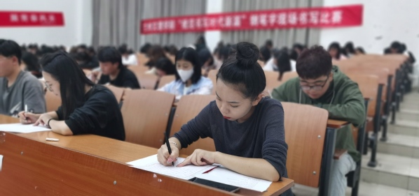 本次比赛共有180名同学报名参加。书写内容以弘扬中华优秀传统文化艺术,歌颂美好生活,反映时代风貌,展示当代高校大学生风采为主题,由主办单位指定范围,参赛选手自主选择书写。比赛中,同学们个个都全神贯注于作品的书写中,一丝不苟,点横撇捺,工整美观,体现出同学们对书法的热爱。