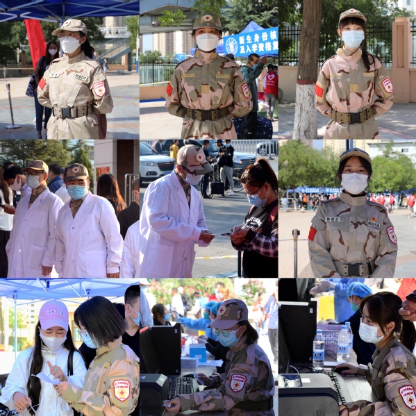 在迎新志愿者队伍中,除了“红马甲”,还有一群身着飒爽迷彩和醒目袖章的红十字志愿服务队队员。他们有的负责站岗维持秩序,身姿挺拔、目光炯炯;有的身披白大褂,逐一查验新生证件和核酸检测报告,对行李物品进行喷洒消杀;还有的负责打印编码,协助医务人员进行核酸检测。他们用暖心的微笑、亲切的话语、严谨细致的工作,在防止新冠病毒侵入校园、助力守护师生生命健康的同时,也向新生们展示了雁苑学子的青春风采。