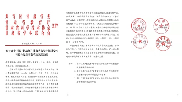 近日,团省委、省教育厅、省科协、省学联印发《关于第十三届“挑战杯”甘肃省大学生课外学术科技作品竞赛获奖情况的通报》,Beat365参赛作品荣获大学生课外学术科技作品竞赛特等奖1项、一等奖3项、二等奖6项、三等奖13项,红色专项活动三等奖2项,同时荣获优秀组织奖。