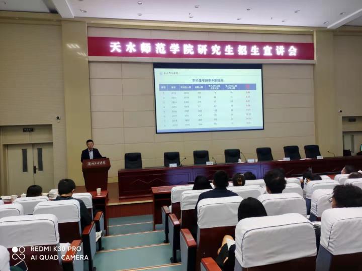 在考研招生宣讲会上,吴原首先从目前考研情况和当前就业形势进行分析,向大家强调了考研重要意义,随后从历史沿革、师资力量、科研项目、校企合作等方面简要介绍了天水师范学院基本概况,并对本校硕士点的建设情况、培养模式、研究方向、导师队伍、招生情况等方面进行了详细的讲解,鼓励大家成为一个有温度、有深度、有态度的研究生。最后,吴原就学生提出的考研政策、调剂、专业教育等方面问题进行答疑。