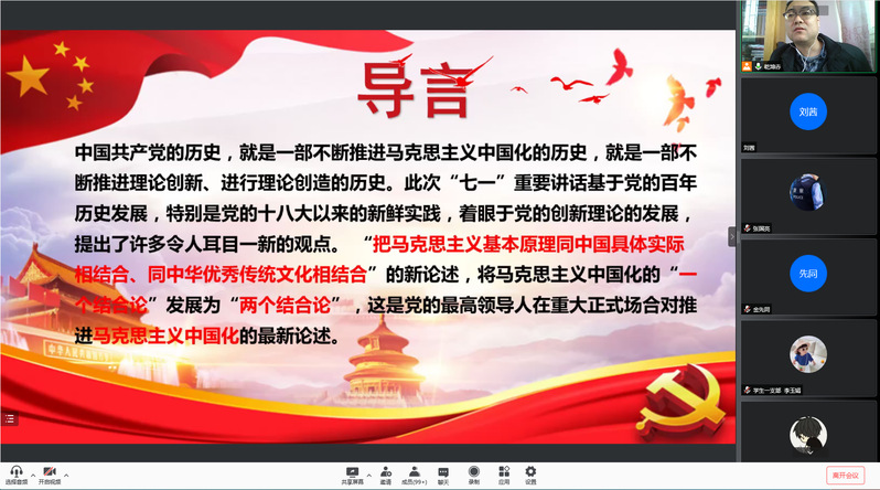 为深入学习贯彻习近平总书记“七一”重要讲话精神,推动党史学习教育走深走实,10月21日下午化工学院党总支在腾讯会议上举行学习习近平总书记“七一”重要讲话精神宣讲会,学校党史学习教育宣讲团成员、马克思主义学院博士梁军作宣讲报告,学院师生党员及入党积极分子近200人参加了宣讲会。
