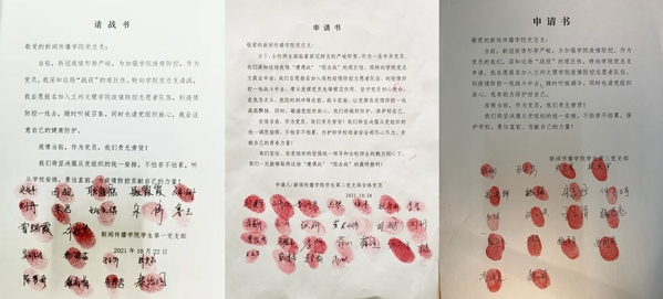 “我主动要求加入学校疫情防控志愿队伍中去,服从组织安排,积极投身疫情防控一线,为保护学校安全尽心尽力,贡献自己的青春力量,请党组织放下……”10月28日下午,新闻传播学院党总支收到了三个学生党支部全体党员的“请战书”,入党积极分子和群众同时踊跃报名参加。
