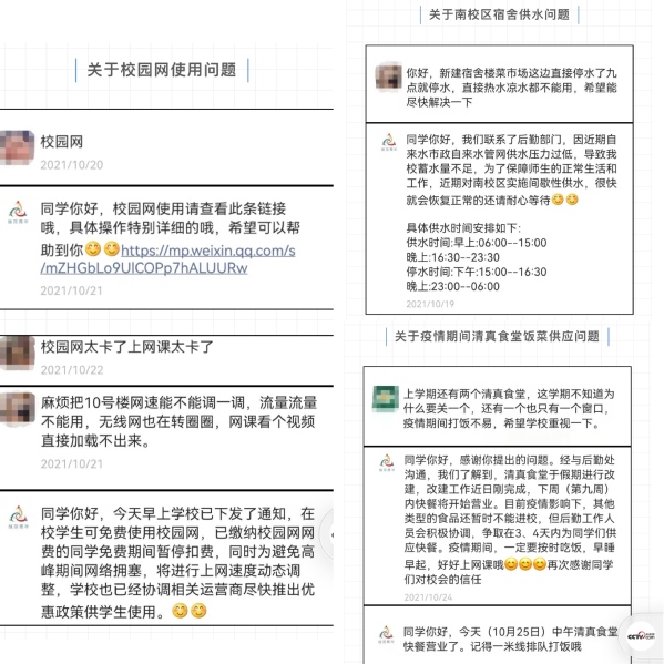 同时,校学生会、小青媒也一直守在“云端”,在“全心权益”学生意见反馈平台上默默关注着同学们的饥寒冷暖,积极回应同学们的意见诉求。本学期开学以来,“全心权益”平台收到很多同学的留言,从宿舍生活到食堂饭菜,从线上学习到课外活动,校学生会工作人员尽己所能给予及时回复和协调解决。疫情爆发以来,“全心权益”平台更是成为了同学们寻求帮助解决问题的意见箱、服务热线。感谢同学们的信任,全心全意为同学服务是校学生会不变的宗旨,校学生会也将继续用心倾听同学们的意见诉求,做好桥梁纽带,服务同学成长,助力学校发展。