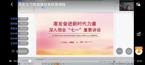 11月3日中午,社会体育学院开展线上党史学习教育专题党课暨形势政策课教育,党课题目为激发奋进新时代力量,深入领会“七一”重要讲话,通过钉钉平台线上教学,由副院长胡曦霞主讲,全院学生及教工党员参加。