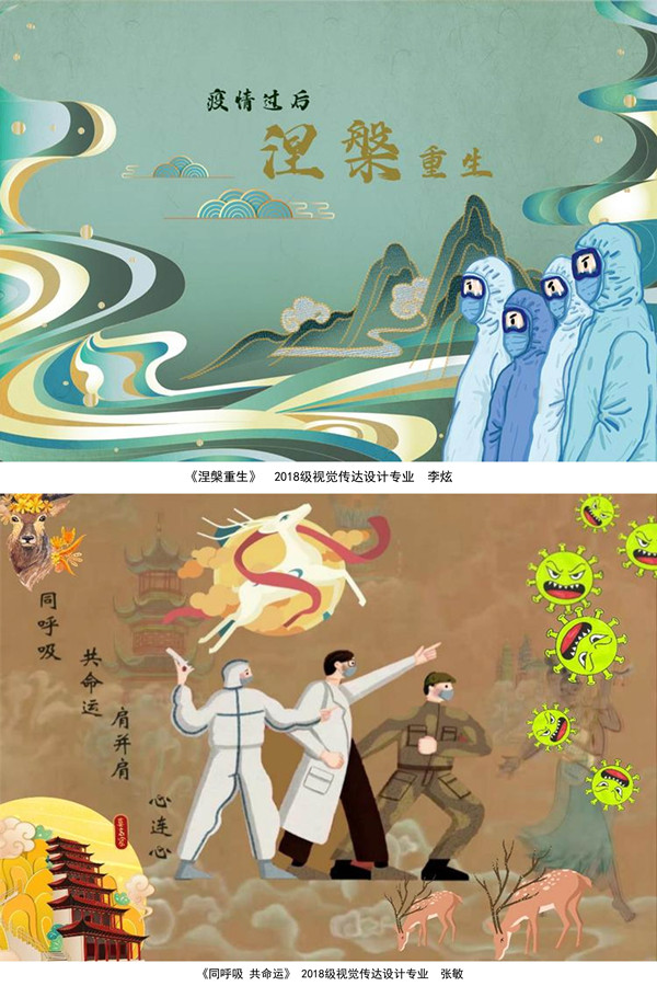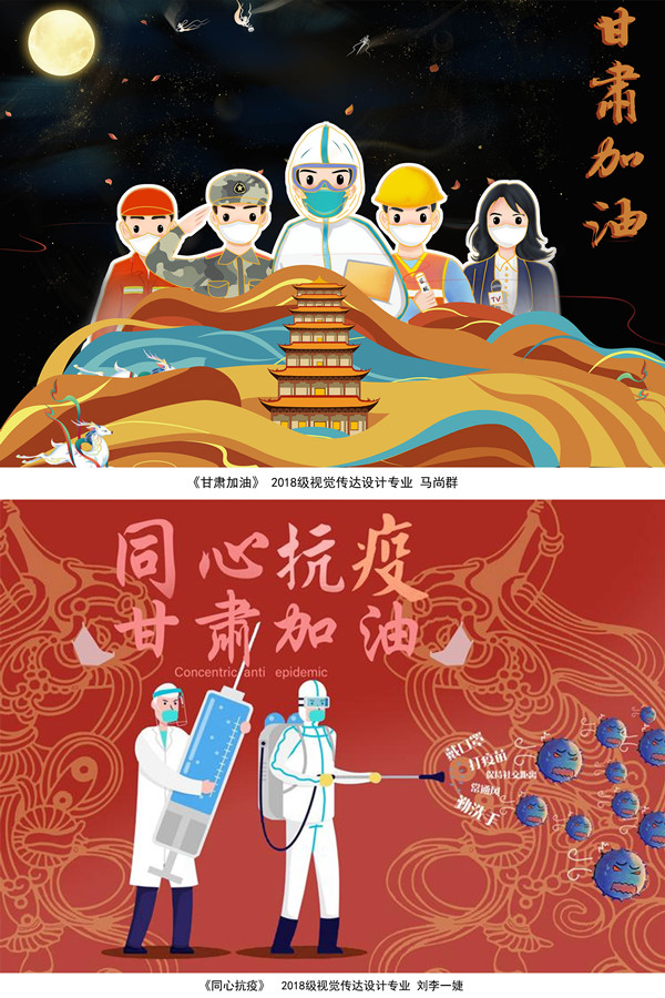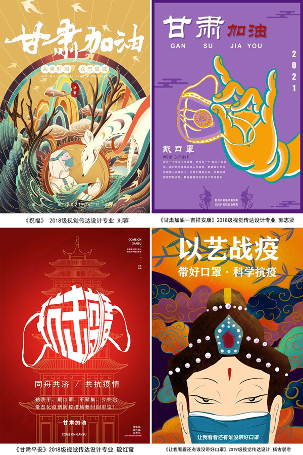 新冠疫情爆发以来,美术与设计学院师生积极配合各类疫情防控工作,认真落实教育部提出的“停课不停教、停课不停学”活动,将在疫情期间“线上教学”中开展课程思政教育的要求落到实处。在《敦煌美术赏析》课程中发挥课程特点和专业特长,将课程中中华传统经典文化知识与“抗疫”要求紧密结合起来,指导学生开展创作宣传抗疫精神的海报作品,产生了一系列优秀作品。这些作品既反映出同学们对特殊时期“防疫抗疫”重要性、紧迫性的高度认识,也表达出了他们对自己家乡的热爱和美好祝福。
