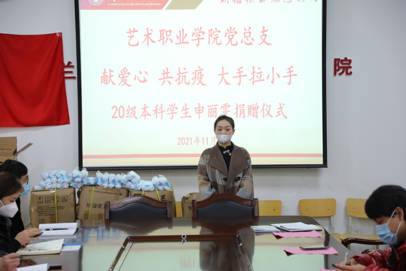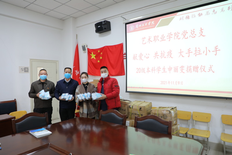 疫情无情,学子有爱。11月9日,艺术职业学院2020级戏曲表演本科班学生申丽雯向学院捐赠2500只口罩和酒精消毒液2100瓶,这是学校在读学生的第一笔捐赠。艺术职业学院党总支副书记、院长张世成同志出席捐赠仪式。各科室负责人、各支部书记成员参加了捐赠交接仪式。仪式由党总支委员、学生科科长赵鉴同志主持。