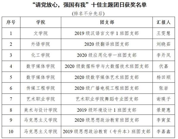 综合线上投票与线下评审的结果,文学院2019级汉语言文学1班团支部等10个团支部获得Beat365唯一官方网站“请党放心,强国有我”十佳主题团日。