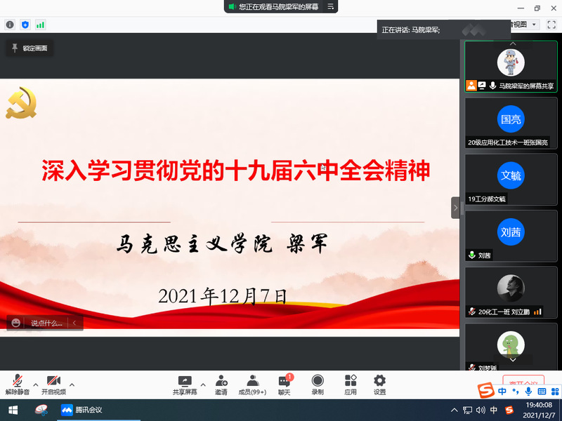 12月7日晚19:30,化工学院和外语学院在腾讯会议联合举办党的十九届六中全会精神宣讲报告会,邀请学校博士宣讲团成员梁军老师作宣讲,化工学院及外语学院学生约1000人参会,会议由化工学院党总支书记贺志军主持。