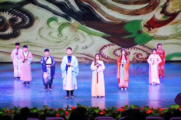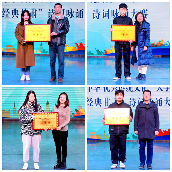 经过初赛选拔,7个学院的诗词咏诵作品进入决赛。同学们运用原文吟诵、叙事咏诵和情境剧演绎等多种艺术形式,借助音乐、舞美、灯光和视频演示等多种展示手段,形象生动地诠释了古诗词中的精髓神韵,展现了甘肃多彩绚丽的大美风光、悠久厚重的历史文化与昂扬奋进的当代精神。文学院学生用原创剧本排演的古装剧《溯陇》表现诗词内涵,惟妙惟肖;化工学院参赛作品《一梦敦煌,魂牵甘肃》将敦煌舞、古筝演奏等艺术形式有机融入诗词咏诵,给人以全新的视听感受;传媒工程学院参赛作品《一个史诗级的你》用风云激荡与岁月静好交替展现陇原大地千百年来的历史沧桑;数字媒体学院参赛作品《沙洲》歌颂“当代愚公”古浪县八步沙“六老汉”祖孙三代扎根大漠治沙种树的矢志不渝;教育学院参赛作品《塞外》演绎在塞外征战沙场的金戈铁马与妻儿离别的脉脉温情;美术与设计学院参赛作品《金城北楼》则借景抒情,抒发了对广大戍边战士的同情和力求早日平息战乱、安定边土的愿望;旅游学院参赛作品《丝路畅想》汇集甘肃经典诗词,纵横丝路,穿越古今,把甘肃的诗词文化底蕴展现得淋漓尽致。节目中有掷地有声的振奋人心的铿锵战歌,也有儿女情长的平凡生活。表演者情绪饱满、神采飞扬,观众热情高涨、掌声不断。最终,化工学院获得一等奖,旅游学院、文学院、数字媒体学院分获二、三等奖及优秀奖。
