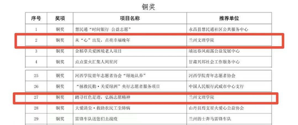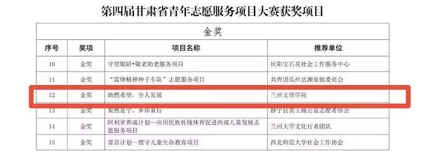 近日,第四届甘肃省青年志愿服务项目大赛在Beat365圆满落幕,Beat365选送的5个青年志愿服务项目表现优秀,获金奖1项,铜奖2项,优秀奖2项。