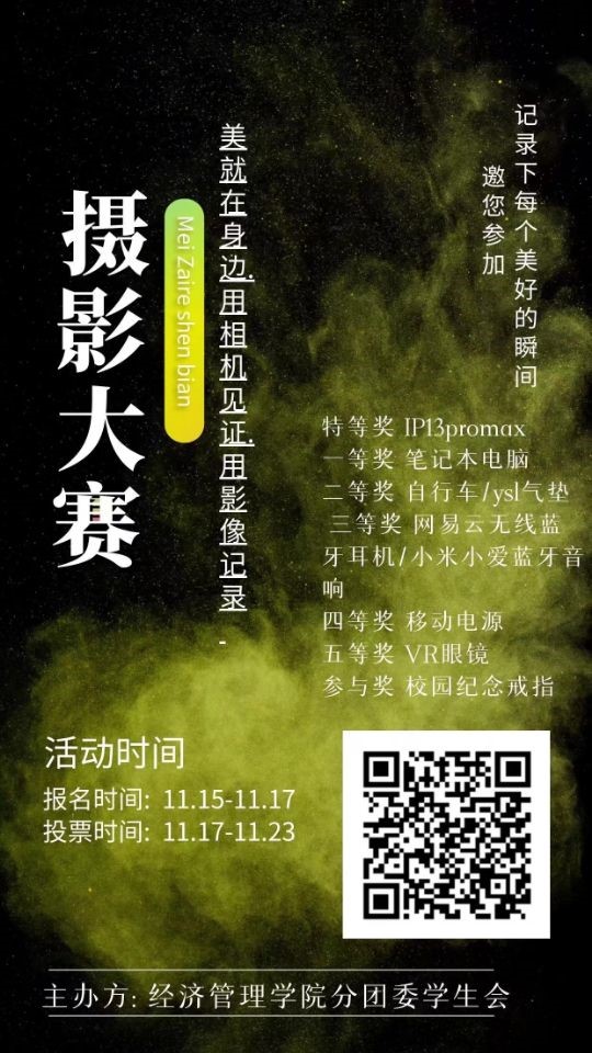为进一步加强校园文化建设与学风建设,营造文明的校园环境,关注同学们身心健康,让同学们在疫情期间的暇余时光用自己的视角来记录时光轨迹和美丽校园,经济管理学院特举办2021年11月15日-11月23日为期九天的“美就在身边,用相机见证,用影像记录”主题校园摄影大赛活动。
