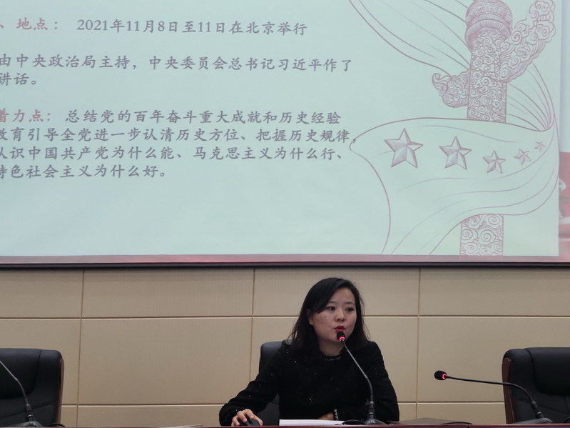 张惠在报告中首先介绍了党的十九届六中全会的概况,并从七个方面介绍了《中共中央关于党的百年奋斗重大成就和历史经验的决议》主要内容,结合党的百年奋斗重大成就和历史经验,分享了自己的学习体会。她讲到,政治信仰决定政治行为,十九届六中全会通过的《决议》对青年一代具有四个方面的指导意义。一是当代青年必须不断夯实政治认同基础,自觉坚持中国共产党的领导;二是当代青年要在党的百年奋斗成就中增强自信,自觉树立自身奋斗目标。三是当代青年应该用奋斗致敬党的百年历史,明确未来发展的方向;四是当代青年要脚踏实地担任起今天的使命担当,做最美的中国形象。