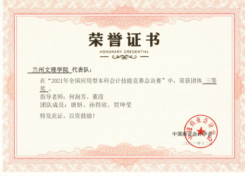2021年12月11日,由中国商业会计学会主办、江苏理工学院承办,厦门九九网智科技有限公司技术支持的2021年全国应用型会计技能大赛全国总决赛落下了帷幕。由经济管理学院的20级财务管理专业的孙得欣、贾坤莹、唐妍等3名同学组成的团队在指导老师何润芳和董滢的带领下,通过紧张激烈的竞争,在全国50所本科高校队伍中脱颖而出,荣获总决赛团体国三等奖,何润芳、董滢老师分别获得优秀指导教师三等奖。