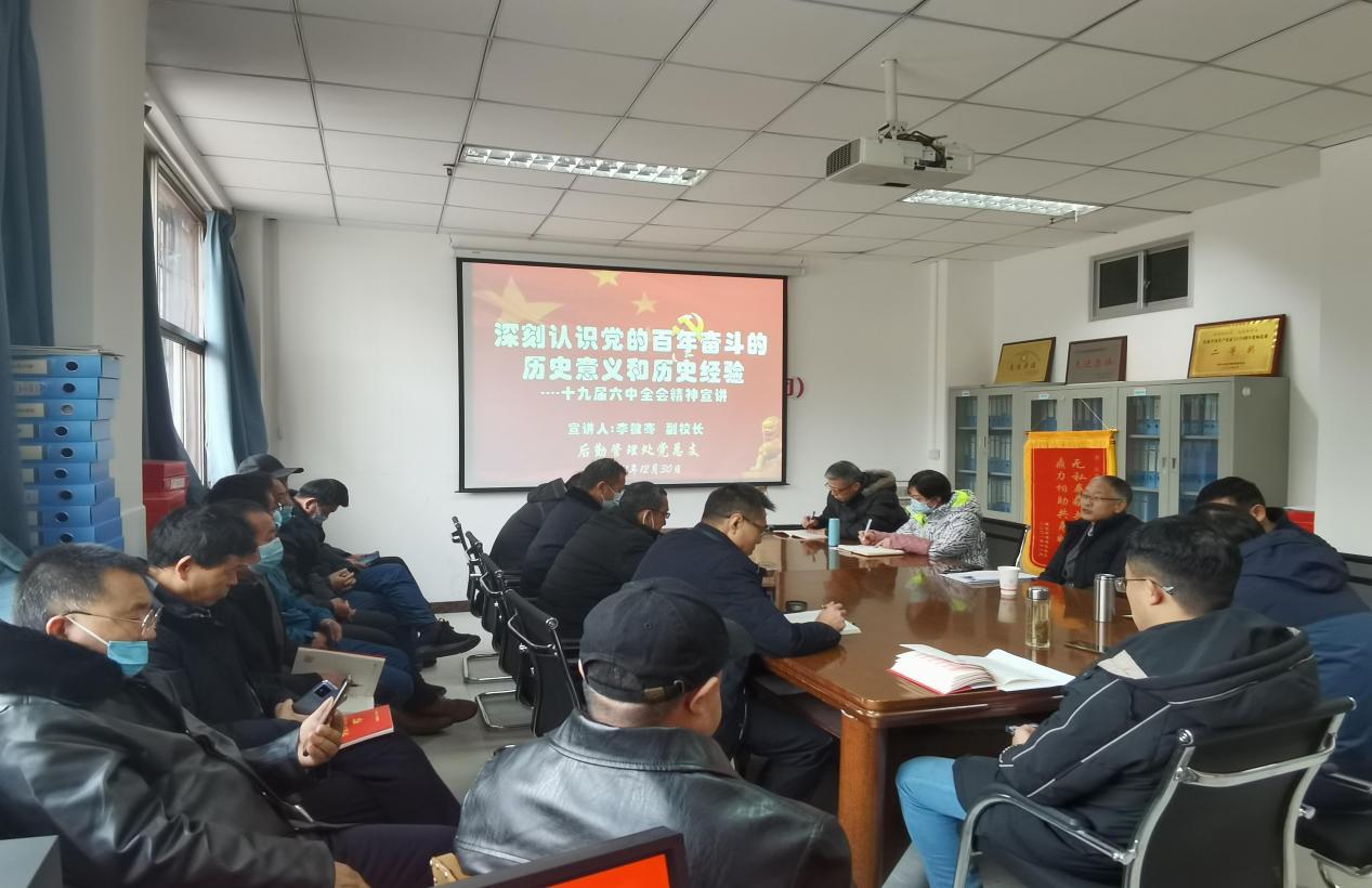12月30日上午,副校长李敏骞以“深刻认识党的百年奋斗的历史意义和历史经验”为题,为后勤管理处全体职工、党员和入党积极分子宣讲党的十九届六中全会精神,宣讲报告会由后勤管理处党总支书记李耀荣主持。