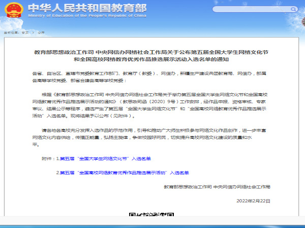 第五届“全国大学生网络文化节”和“全国高校网络教育优秀作品推选展示活动”由教育部思想政治工作司、中央网信办网络社会工作局主办,活动旨在推动广大师生积极参与网络文化作品创作生产,扩大高校网络文化影响力,不断强化守正创新,增强新时代高校思想政治工作的吸引力和实效性。