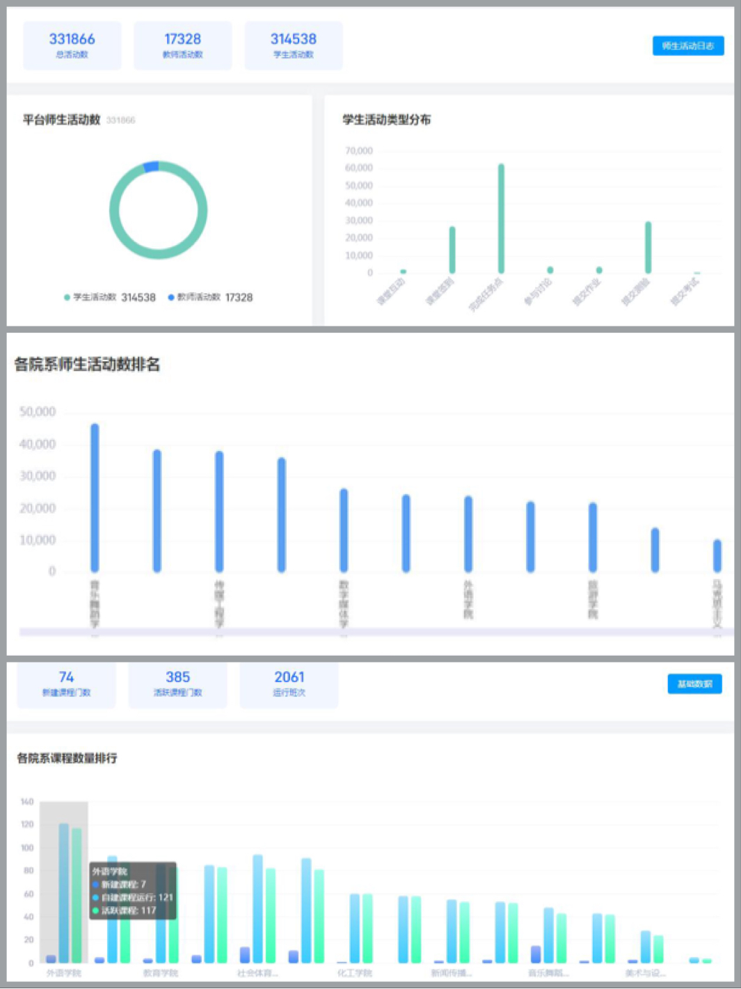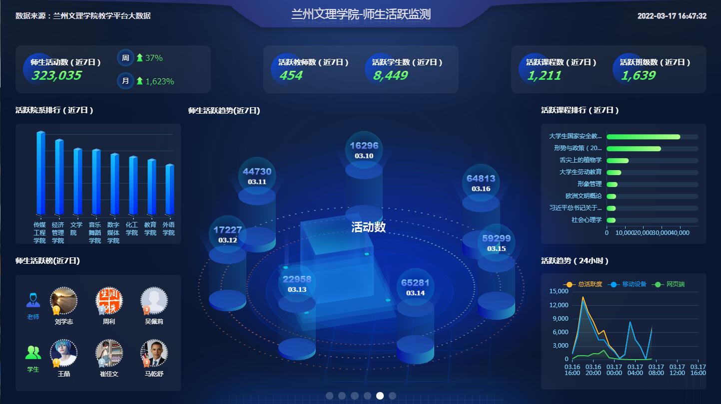 近年来,学校在推进信息化教育教学改革的进程中,持续引进超星、学堂在线、智慧树、中国大学MOOC四家教学平台和优质在线课程资源,形成“4+N”多平台运行、多手段并进的在线教学模式。此次疫情在线教学期间,学校混合式网络教学平台新增自建课程74门,上线课程385门,运行班次2061次,教师活动数达17328次,学生活动数达314591次。仅17日上线学生7215人、上线教师289人,在线教学运行平稳有序。