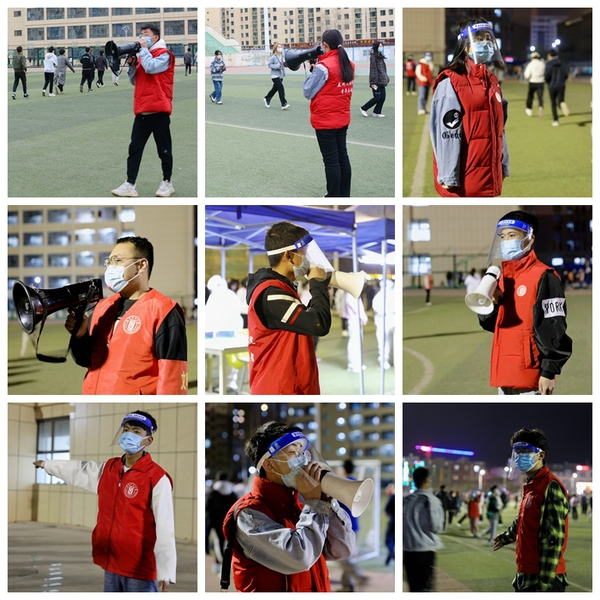 六轮核酸检测现场,经过培训的志愿者们做好防护整装上岗。晨曦的微光中,他们是“场地搭建员”“物资运输员”。校学生会志愿者马溯和伙伴们总是早早来到操场,搭建帐篷、摆放桌椅、整理分发物资。核酸检测开始后,他们是“秩序疏导员”。“同学请保持安全距离”“同学们请提前准备好健康码”“做完核酸的同学请迅速离开”……无论是傍晚还是深夜,他们总是坚守到师生员工全员核酸检测结束,收好帐篷、整理好物资,才开始一天的晚饭。