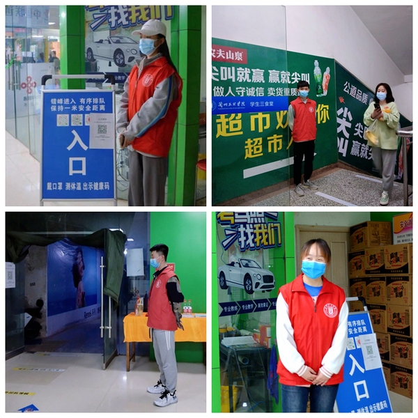 超市的出入口,从早到晚12个小时,各学院学生会志愿者们利用无课时间组建起一支有力的接力执勤队,有序疏导同学们单进单出,并控制超市的人流量。