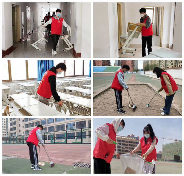 4月9日上午,校青年志愿者协会组织志愿者对二号教学楼二、三、四层临时用于工勤人员宿舍的教室内环境进行整理,将课桌椅搬回原位,保障线下教学环境。4月10日下午,志愿者们在第一运动场开展环境卫生清洁,捡拾跑道、沙坑、草皮上的垃圾,保证体育活动安全与操场洁净。