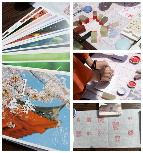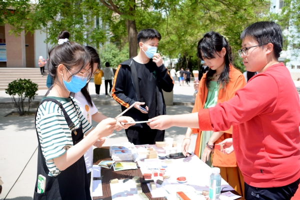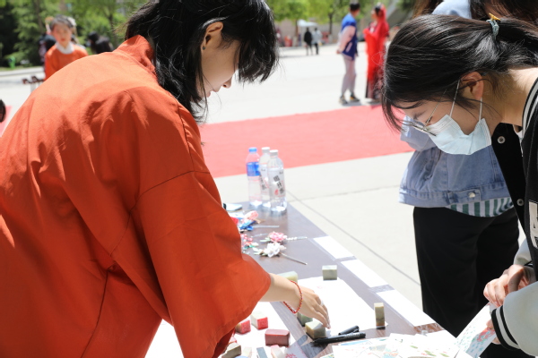 现场还设有投壶游戏区、缠花展示区和茶艺体验区。在投壶区,同学们可以通过参与中国古代传统投壶游戏获得明信片等小礼品,并以明信片“集邮”的形式,为大家展示传统金石篆刻的特殊魅力;还可以在缠花展示区近距离感受缠花这一中国传统工艺之美;茶艺体验区准备了金桔水果茶和云南普洱茶等自制茶包,在碧树蓝天的映衬下,“茶艺师”娴熟地温壶、冲泡、分茶、敬茶,让路过的同学不禁驻足观看,品味茶香。
