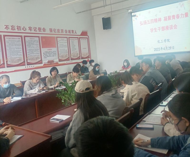 4月29日下午,化工学院在学院会议室召开以“弘扬五四精神,凝聚青春力量”为主题的学生干部座谈会。学院副院长王尹杉、辅导员、分团委和学生会干部以及各班班长三十余人参加,座谈会由学院党总支书记贺志军主持。