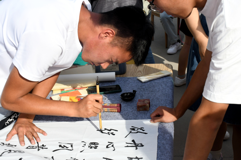 “浓浓端午情,笔墨传真情”。书法协会社员们再次展示现场书写,他们挥毫泼墨,软笔硬笔兼得,书写与纪念端午节的诗词,并示范了书法《安康》的书写。参与活动的同学们可以任意抽取“诗歌接龙”的题目,若能正确答出下句诗词,即可让书法协会的成员现场书写,定制属于自己的书签。书法之美、诗词之美,让同学们零距离地感受到富有精神内涵、饱含艺术魅力的传统节日文化。