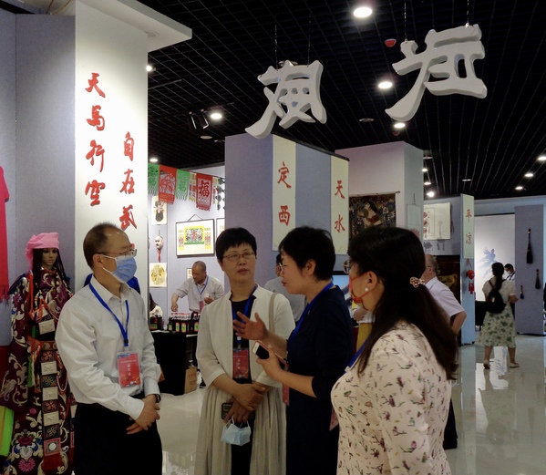 在活动开幕式上,普登学受邀为我省第五批国家级非遗代表性项目所在市(州)文旅部门颁发了牌匾。随后,学校智库专家前往甘肃省非遗系统性保护工作成果展展区、甘肃省2022年“非遗购物节”活动展区、甘肃省非遗影像展展厅、张掖市非遗工坊传承人工作室,实地参观了解全省非遗系统性保护工作成就,并与非遗传承人开展互动交流、座谈工作。