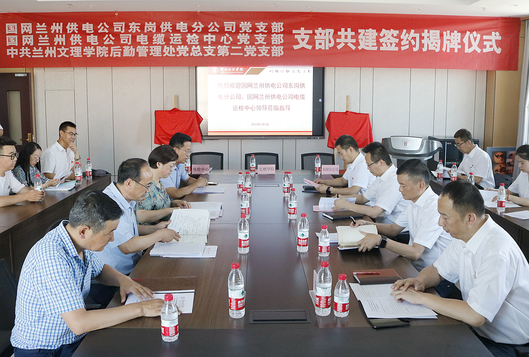 7月7日下午,国网兰州供电公司东岗供电分公司党支部、国网兰州供电公司电缆运检中心党支部来校考察交流,并举行了支部共建签约和揭牌仪式。后勤管理处全体党员参加,会议由后勤管理处党总支第二党支部书记史照辉主持。