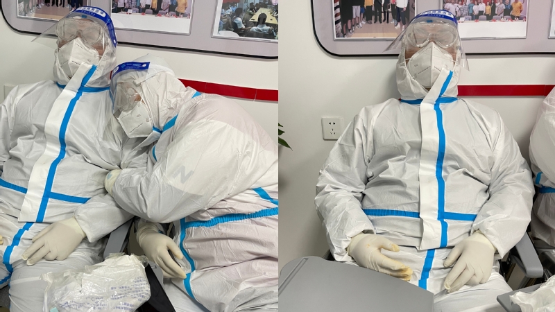“开始采核酸了,准确粘贴试管码,核酸检测务必做到不漏一人。” 凌晨,伴随着一声通知,奋战在10号学生公寓楼的团队一天的工作开始了。学生的一日三餐、急需物品及用药等保障,全靠老师们肩扛手提,逐楼逐层逐宿舍准确配送到指定位置。因长时间佩戴口罩,老师们的脸被勒出了一道深深的印痕,有的甚至出现了发炎、过敏的情况,双手也因长期佩戴手套出现皮肤溃烂。工作伊始,时间紧任务重,有时休息仅两个小时左右,老师们累了困了,就躺在座椅上休息片刻。他们有的连续12小时不喝水不上厕所,只怕浪费了身上的防护服,只好憋着,扛着,熬着。大家都有着一个共同的信念,那就是尽自己所有的努力,将疫情的影响降到最低,守护同学们的健康与平安。