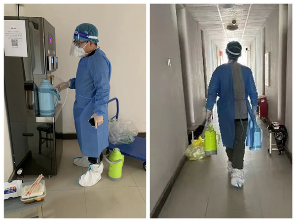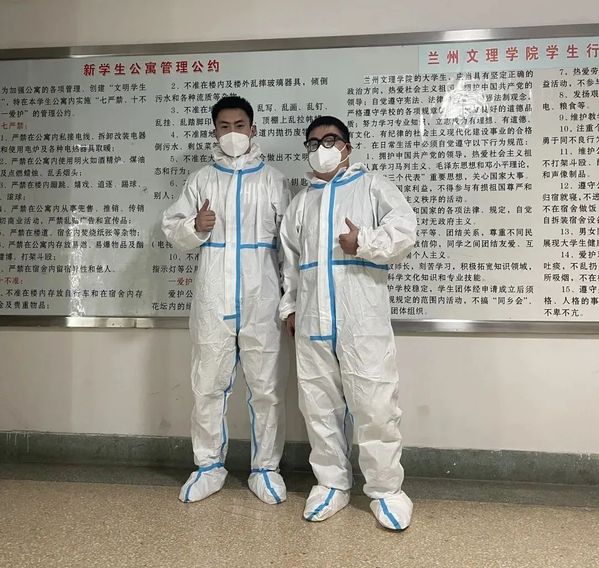 随着爬上爬下气喘吁吁,大家的防护面罩已经被雾气模糊得一片朦胧,身上的衣服也已经被汗水浸湿。但大家都毫无怨言,反而开心地说“好久没这样运动过了”“我的微信步数终于破万了”“今天又能减减肥了”……我们的服务工作一直持续到了晚上九点半左右,再次确认了各个宿舍的同学都领到晚饭、防疫物资以及热水后,结束了第一天的工作。