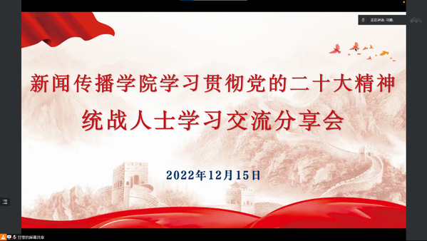 为深入学习宣传贯彻党的二十大精神,加强党的理论学习,进一步坚定信心、凝聚共识、奋勇前进,推动全院上下持续兴起学习宣传贯彻党的二十大精神热潮,新闻传播学院于12月15日14时在线上召开学习贯彻党的二十大精神统战人士学习交流分享会。学院全体教职工、各班学生代表共计50余人参加,会议由党总支书记李军主持。