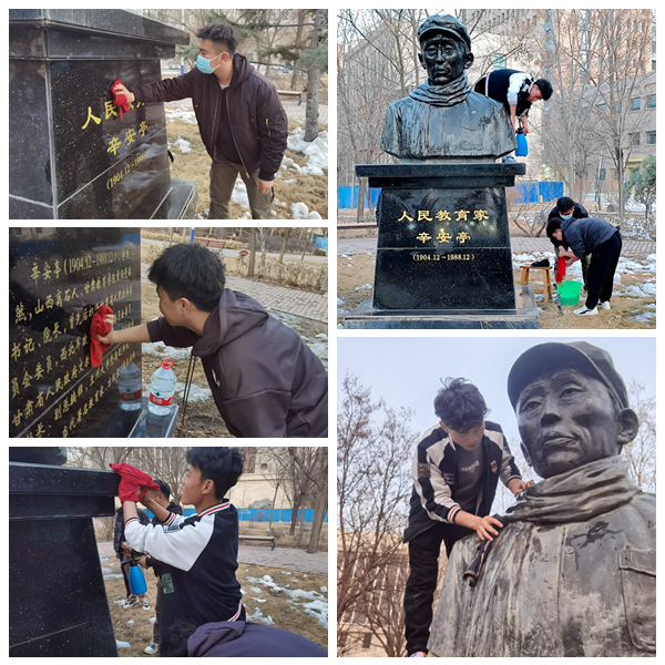 经历了一个冬天的冰雪洗礼,辛安亭先生的铜像蒙上了一层厚厚的灰尘。校学生会工作人员返校报到后第一时间来到安亭铜像前,攀上爬下清扫擦拭,让铜像面貌焕然一新。潘福浩同学说:“雁苑是我们的家园,辛安亭先生是雁苑精神的代表,清扫辛安亭先生铜像是我早就想好返校后要干的第一件事”。