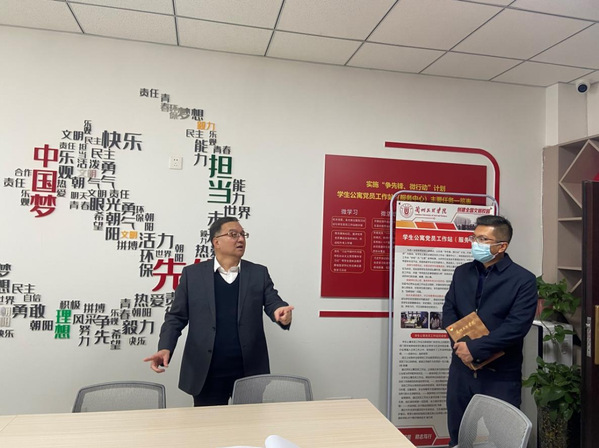 走访10号楼学生公寓党员工作站时,郑伟强表示,党员工作站既是学生党员开展理论学习和实践锻炼的主阵地,也是重要的党员服务窗口,对于发挥党组织引导人、团结人、凝聚人有着不可替代的作用,要努力将党员工作站打造成师生共同成长发展的新平台和服务型党组织建设的新阵地。
