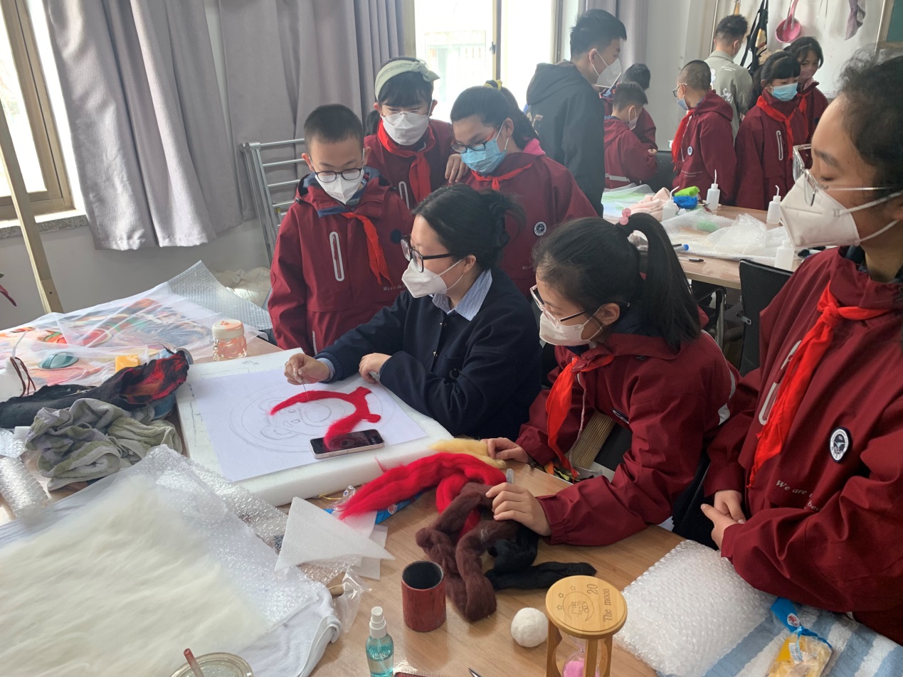美育能够使受教育者在潜移默化的环境熏陶和影响下,形成一定的审美品位和审美追求,根据雁东路小学美育浸润计划需求,美术与设计学院工作人员陪同雁东路小学一行参观了美术与设计学院展厅、装饰艺术实训中心,了解了中国画、油画、水彩画的各种表现形式和羊毛擀毡、扎染陶艺、漆艺等工艺美术门类,同时通过积极开展陶艺、纤维艺术、漆艺等丰富多彩的美育课堂实践活动,让雁东路小学的师生们在色彩的世界里感受美、欣赏美、发现美,引领学生树立正确的审美观念。