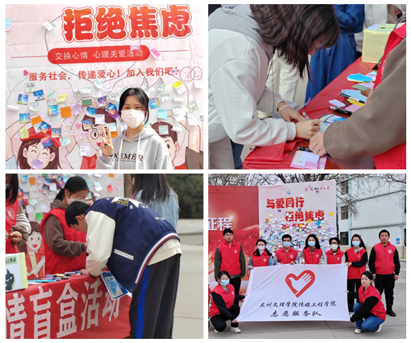 3月18日,传媒工程学院志愿服务队在思源楼小广场开展了“交换心情,拒绝焦虑”心理关爱活动。志愿者们鼓励同学们写出自己内心的焦虑并勇敢释放出来,同时抽取一份正能量满满的鼓励便签,帮助同学们走出精神内耗怪圈,坦然面对成长的挫折,用阳光心态积极面对青春的挑战。
