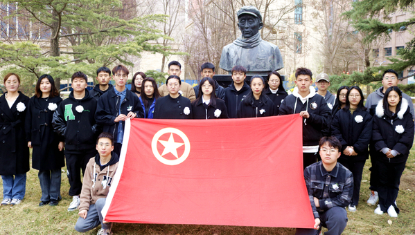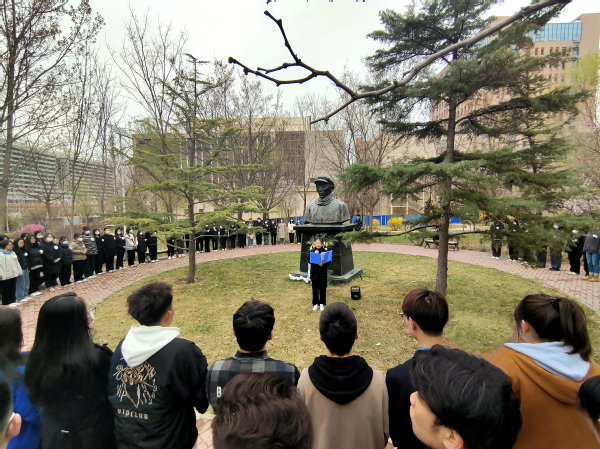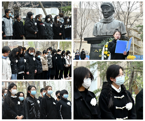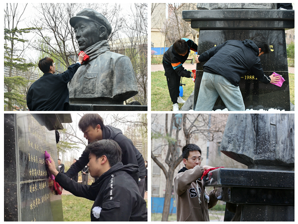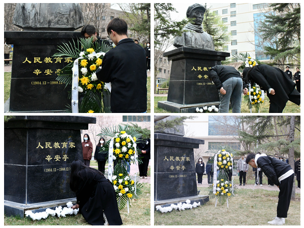 4月5日清明节当天,校院两级学生会工作人员来到南校区辛安亭铜像前开展祭扫活动。清晨的校园小雪霏霏,苍松翠柏间,人民教育家辛安亭先生的铜像静静伫立,清癯的面孔、坚定的目光令人肃然起敬。同学们手持喷壶、抹布,认真擦洗铜像,使之焕然一新。怀着无比崇敬之情,同学们缓步上前,向辛安亭先生铜像敬献花篮和亲手制作的纸花,神情肃穆,鞠躬、默哀,并以主题演讲的形式表达对辛安亭先生的深切缅怀,发出了传承先辈意志、勇担时代使命的铿锵誓言。