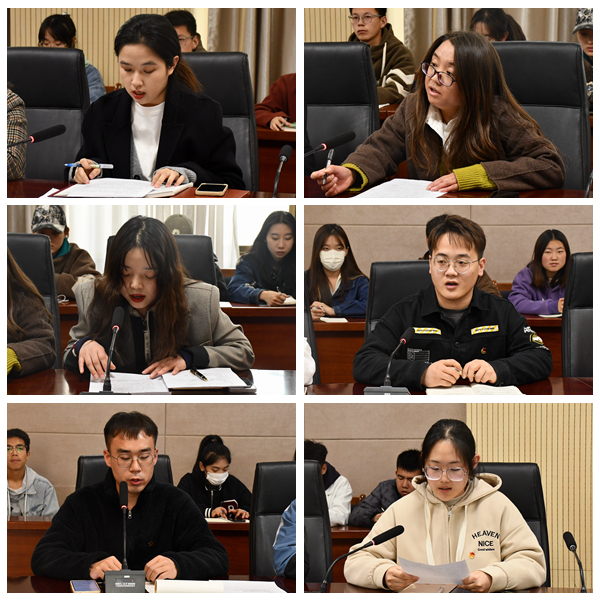 “校训精神大家谈”环节,围绕“明德强能,励志笃行”八字校训,校团委刘嘉璐、文学院分团委贾娜、新闻传播学院分团委关思宁三位团干部分别围绕校训的基本内涵,结合自身工作实际,谈了对校训精神的认识和感悟,并就如何在师生中传承和弘扬校训精神提出了措施建议。校学生会马浩宇、学生社团管理部张轩铭、校青年志愿者协会惠印良及俞婧四名同学分别结合自身学习成长经历、结合参与社会实践和志愿服务的心得感悟,讲述自己在雁苑的成长故事,表达了铭记校训精神、践行青春担当,努力成长为有理想、敢担当、能吃苦、肯奋斗的新时代好青年的决心。师生们齐唱校歌《雁苑之歌》,激发荣校爱校之情、青春奋斗之志。