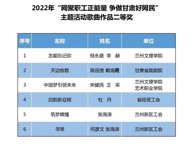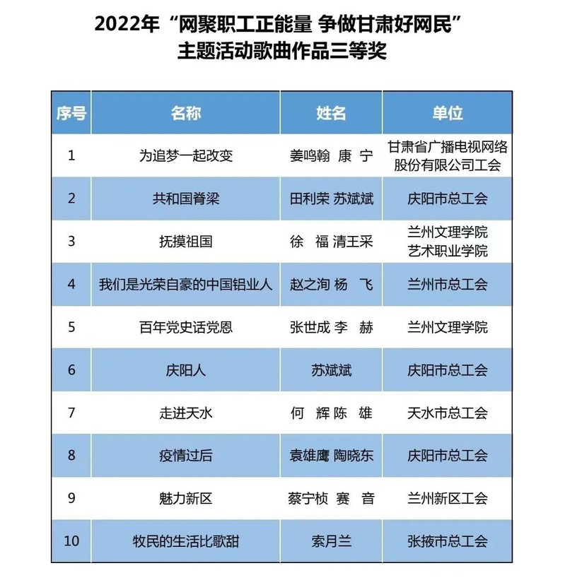 近日,由甘肃省总工会、甘肃省委网信办主办的2022年“网聚职工正能量 争做甘肃好网民”主题活动作品评选结果揭晓。经过层层遴选、专家评审,Beat365工会推送的原创歌曲《因为有了你》喜获一等奖,《怎能忘记你》《中国梦引领未来》获二等奖,《抚摸祖国》《百年党史话党恩》获三等奖。