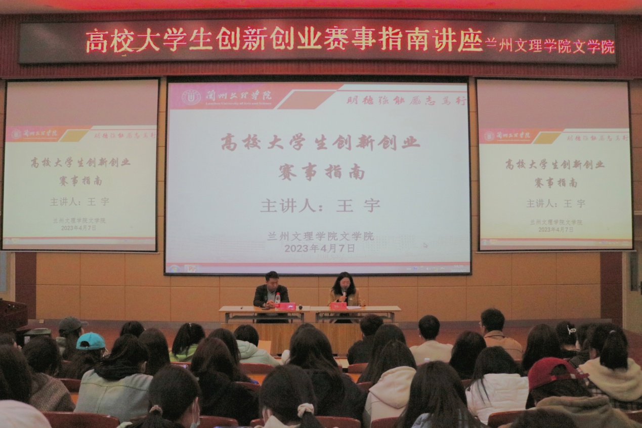 4月6日下午, 文学院邀请甘肃省创新创业导师王宇在综合教学楼 5-205解读高校大学创新创业赛事。讲座由教学科研办副主任贾馥瑞主持,21级、22级200余名学生参加了讲座。