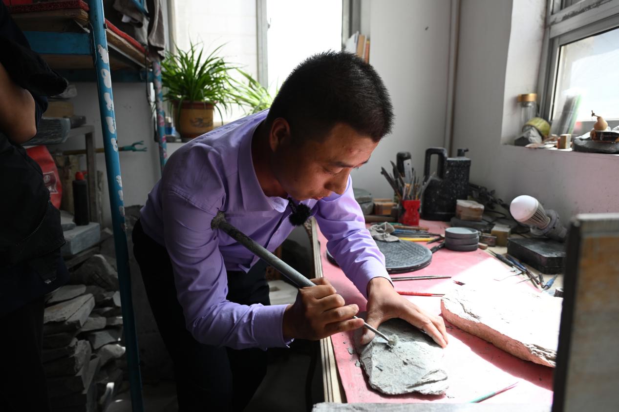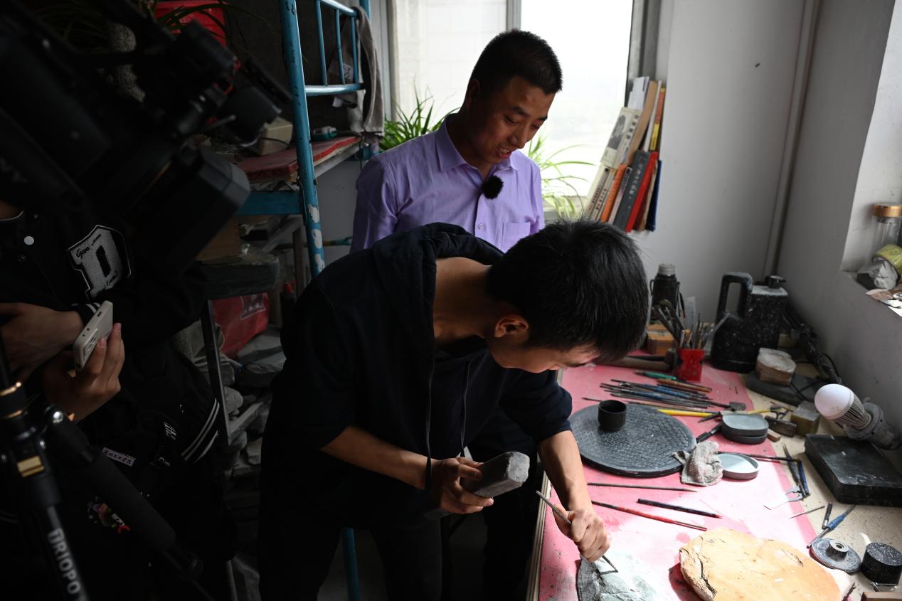 李江平主要通过洮砚展品讲解了洮砚相关知识,并展示了雕刻洮砚制作过程,还让同学们上手进行操作。