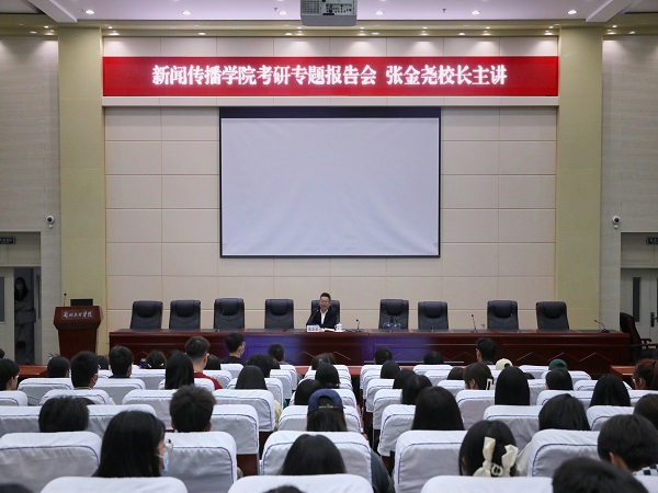 4月13日晚,新闻传播学院在综合楼学术报告厅召开考研专题报告会,20、21、22级本科班及班主任参加。本次专题报告会由副校长、院长张金尧主讲,副院长胡源主持。