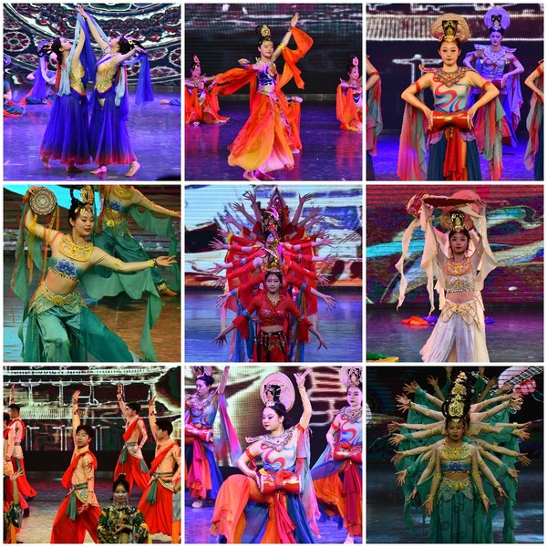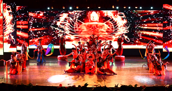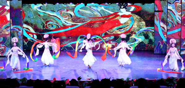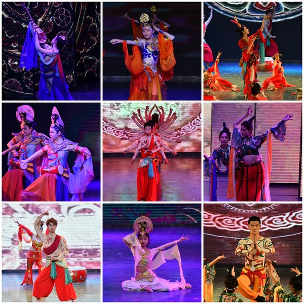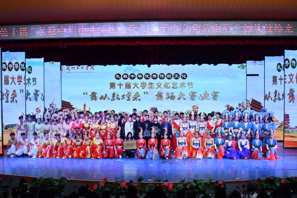 新闻传播学院、社会体育学院、教育学院、传媒工程学院、文学院、数字媒体学院、外语学院、化工学院8支队伍先后登场,为观众呈现了一场充满浓郁敦煌文化元素的舞蹈“大餐”。表演者情绪饱满、神采飞扬,或反弹琵琶,或彩绸轻舞,或典雅庄重,或刚劲矫健,将敦煌飞天的神韵、菩萨的端庄、金刚的威猛展现得淋漓尽致。“凌云翩翩寻梦回,且看飞仙舞梵心。”婀娜的舞姿搭配绚丽的视频背景,仿若敦煌壁画上的人物美轮美奂、如梦如幻。李莉教授在点评中对同学们的表现充分肯定,希望同学们从敦煌舞中感悟艺术之美、感受敦煌文化的魅力,让中华优秀传统文化永续传承、发扬光大。