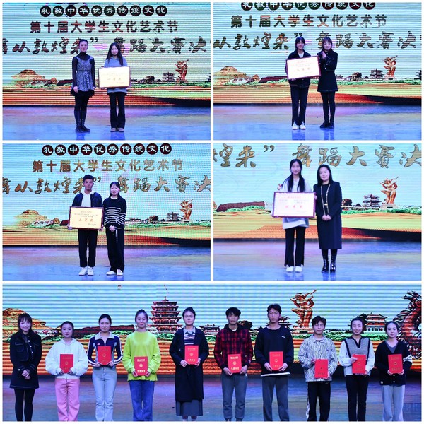 最终,数字媒体学院《一梦敦煌》荣获一等奖,教育学院《仙鼓乐》获得二等奖,社会体育学院《惊鸿梦》获得三等奖,化工学院《凌云梦敦煌》获得优秀奖。在本次比赛排练过程中,艺术职业学院舞蹈专业的9名优秀学生担任指导员,对各学院参赛作品进行了指导。活动现场为指导学生颁发了荣誉证书。