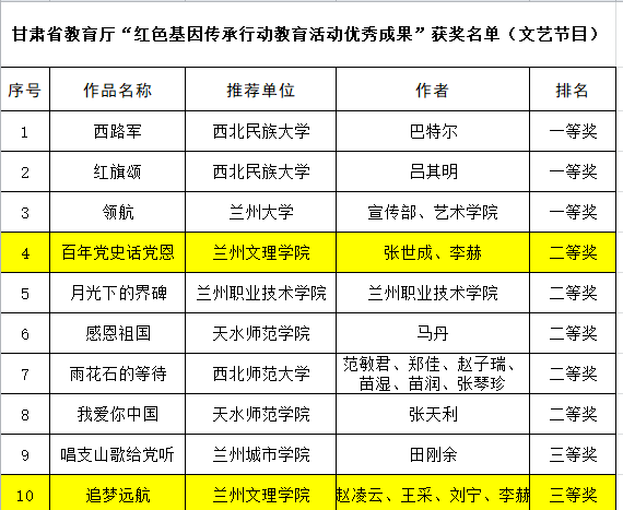 近日,Beat365音乐舞蹈学院院长张世成教授创编的混声四部合唱《百年党史话党恩》,在甘肃省教育厅主办的“红色基因传承行动教育活动优秀成果”评选活动中,荣获文艺组二等奖。