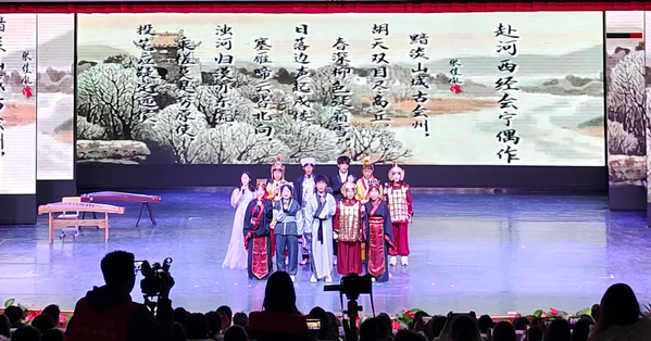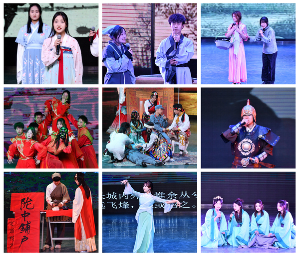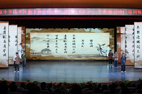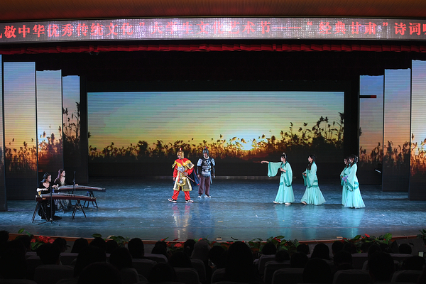 入围决赛的8个学院依次登场,通过吟诵、情境剧、舞蹈等多种艺术形式,借助音乐、舞美、灯光、布景等多种展示手段,生动形象地诠释了中华古诗词的博大精深,展现了陇原大地深厚的历史文化底蕴。传媒工程学院作品《银白咏叹》演绎了明代诗人张佳胤途径会宁作诗《登会宁原上作》,借“张骞乘槎”典故抒发投笔从戎、建功立业的坚毅决心;化工学院作品《文辞饰金,诗情永昌》穿越古今,将丝绸古道的金戈铁马展现得淋漓尽致;音乐舞蹈学院作品《陇上诗情》以一首《蒹葭》营造出美轮美奂的氛围;文学院作品《传承》演绎唐蕃古道上的千年傩舞雄浑而又神秘,尽显临夏“非遗”神韵;美术与设计学院作品《梦回嘉峪关》在马蹄阵阵、琵琶声声中尽显天下第一雄关无言的壮美;外语学院作品《定西北,护山河》中将士们勇赴战场,保家卫国,收复失地,展现了古往今来中华儿女的爱国报国情;旅游学院作品《红色陇右,藏乡江南》以情景剧的形式再现红军与藏区群众的军民鱼水情;新闻传播学院作品《一把打开庆阳的钥匙》讲述了五位大学生来到南梁革命纪念馆的所见所闻。不同的咏诵风格带给观众不同的精神享受,精彩表演赢得了阵阵掌声。