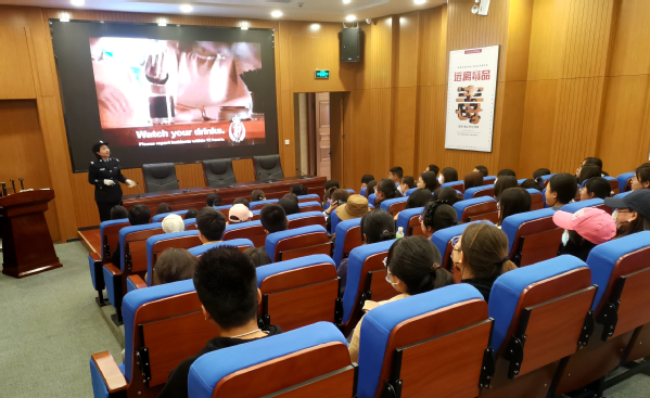 基地讲解员陈警官带领同学们观看了警示教育短片,了解娱乐场所形形色色的“毒品陷阱”,通过“是谁把药放在了你的饮料之中”等案例告诫同学们,娱乐场所的毒品接触只在一瞬之间,必须绷紧毒品防范这根弦。