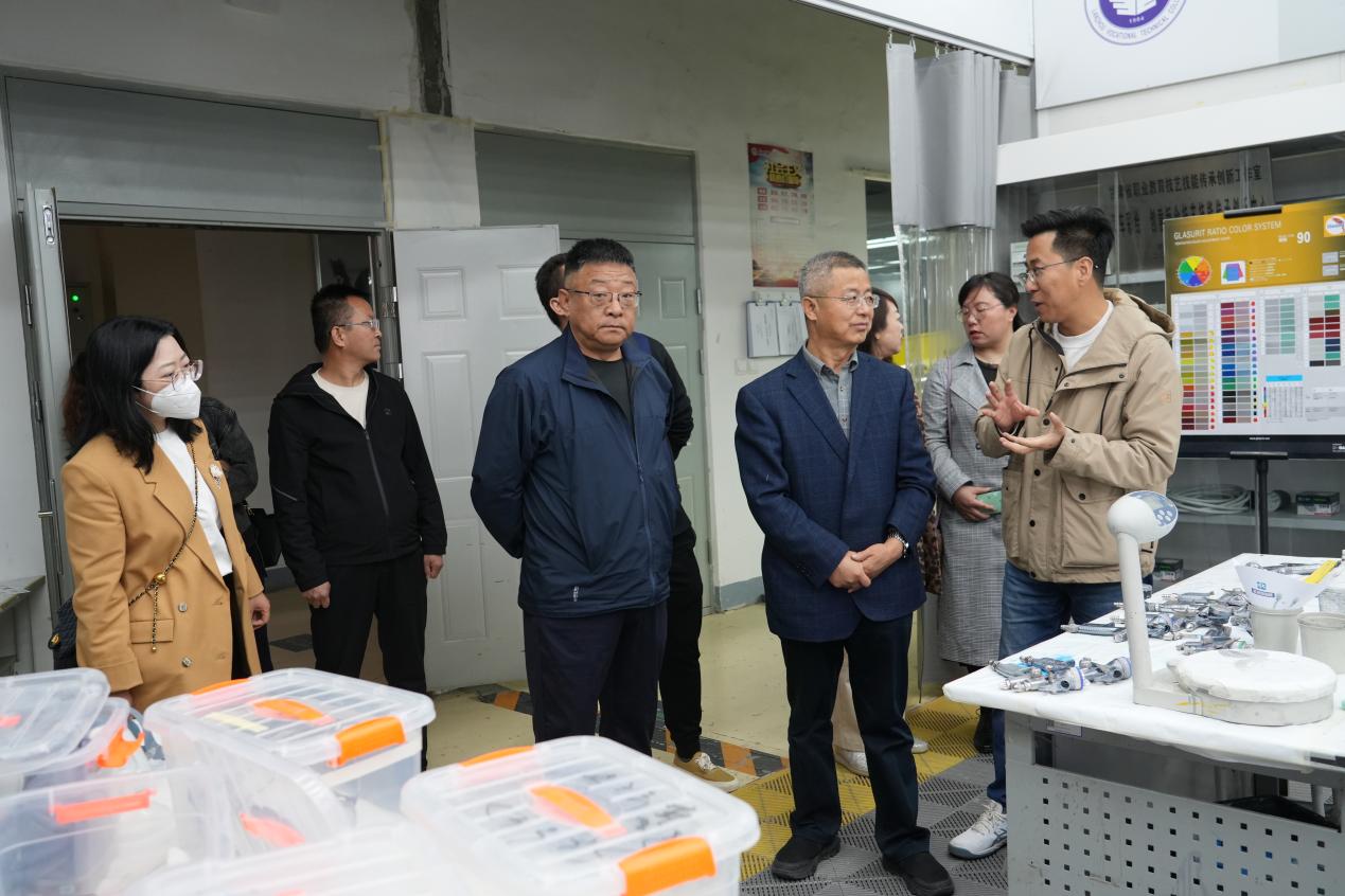 王克太一行先后参观了兰州职业技术学院笃行中心、躬行中心、汽车技术实训中心、机械工程实训中心、电子信息工程系、非遗学院等教学场所,重点调研非物质文化遗产学院的办学情况,参观了以传统手工艺加工教学为核心的非遗小院,敦煌彩塑、洮砚、唐卡、剪纸、彩陶、木雕、葫芦雕刻、古籍修复、版画、书画装裱等大师工坊,与洮砚制作教师王玉明、剪纸教师史婷等非遗传承人现场交流。