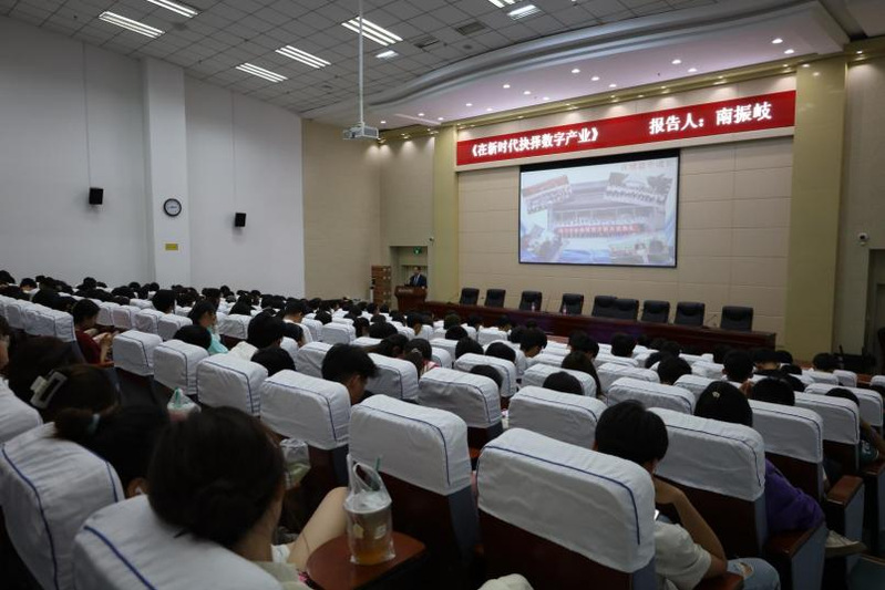 南振岐在报告中介绍了数字产业的发展背景,分享了企业在数字化转型中所面临的抉择,并探讨数字化转型中的关键要素,通过图片、视频分享了一些数字化转型的成功案例,让学生们更好了解到数字化技术如何应用于项目开发。随后学生们积极提问,南振岐结合专业领域发展进行了详细解答。