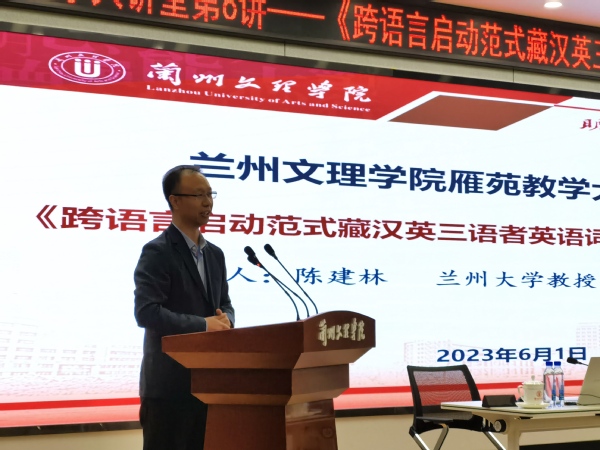 6月1日下午,外语学院在文昌楼302举办了雁苑教学大讲堂第6讲。邀请兰州大学外国语学院教授、博士生导师、副院长陈建林作题为《跨语言启动范式下藏汉英三语者英语词汇语义通达机制研究》的学术讲座。外语学院院长张同俊主持讲座,学院师生300多人参加。